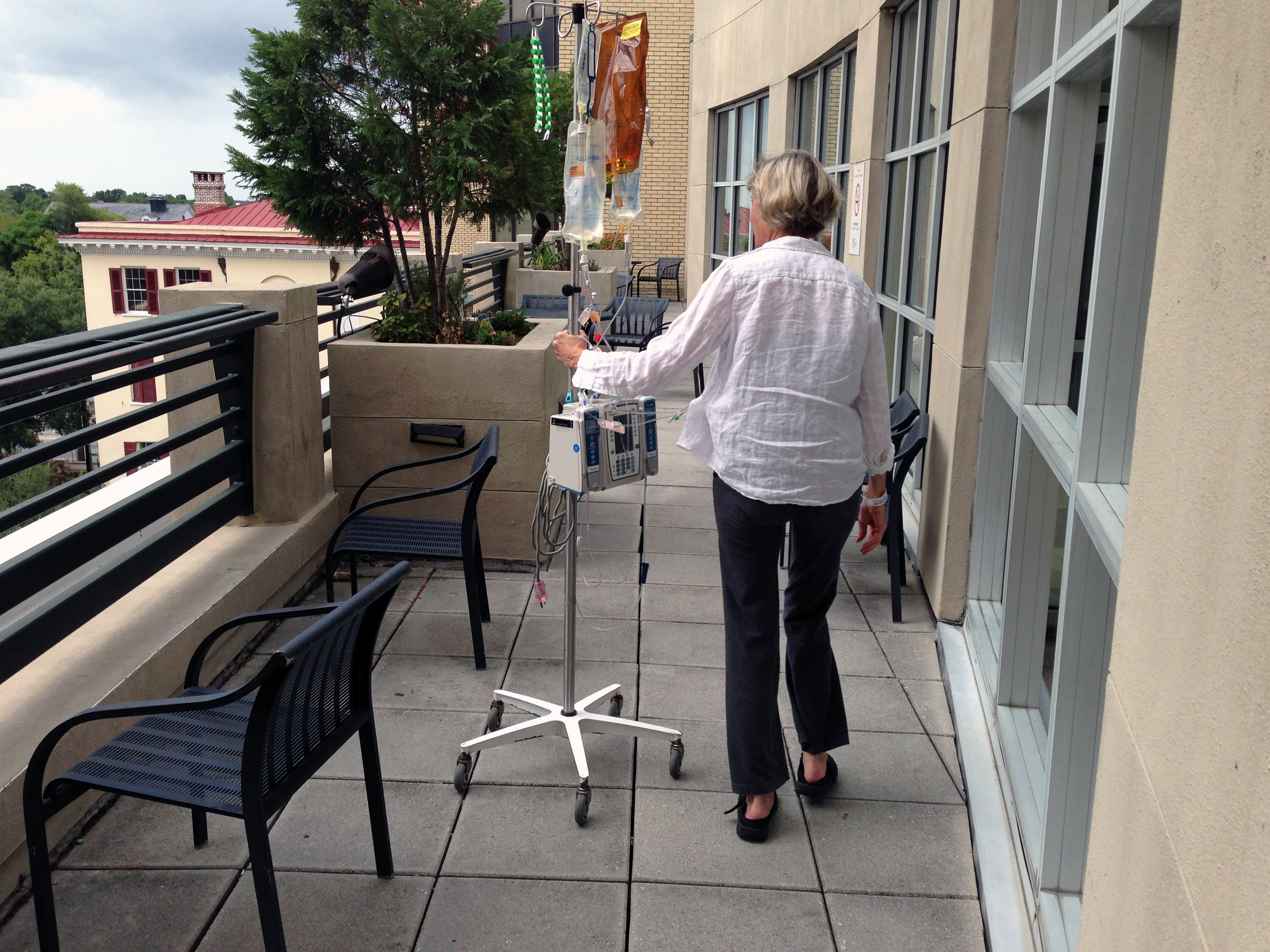 My beloved’s here for five days, Monday through Friday, for 96-hours of constant infusion of a chemo regimen that goes by the acronym EPOCH. She’ll go home Saturday, have two weeks off, then return to Roper for five more days and repeat this pattern for six to eight cycles.