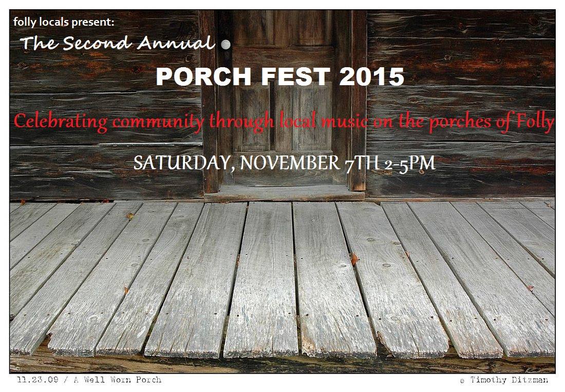 The “concert series” Porchfest originated in Ithaca, New York, in 2007 as a means for musicians to share songs with their communities in informal settings. Not only has the Ithaca Porchfest grown from 20 performers to more than a 100, the concept itself has spread across the country all the way to Folly Beach, SC, the so-called Edge of America, and yesterday (8 November 2015) Folly held its second iteration of what I hope will become an annual event.