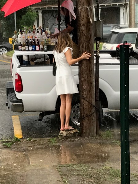 While we were standing there, a float arrived claiming to be the Big Chief’s float, and some generous souls stood at the railing handing out half pints of some kind of clear liquor, and when those ran out, Mardi Gras beads. Not wanting to intrude, Loquacia and I had to settle for refreshments provided by street vendors.