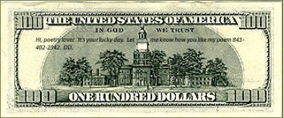 Whoa! Wait a minute! What was that? He thumbed through more slowly, and it was there, a $100 bill. Excited, he flipped the note over to assure himself it was legal tender. Someone had written something above the trees and steeple of Independence Hall. A message?