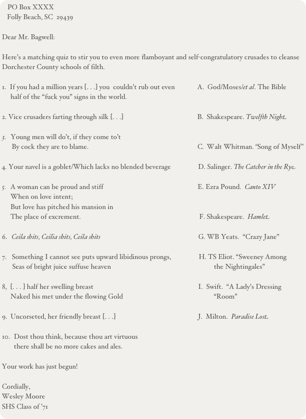 Perhaps because Mr. Bagwell had pilfered from my former high school’s library and because I had grown up just down the street from him, I felt chagrined enough to send him the following correspondence (signed with my return address):