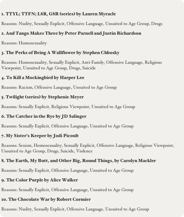 At any rate, the student’s interview request prompted me to do some digging into what texts have now replaced Catcher in the Late Empire as catalysts for censorship, those books in 2011 that rile parents into pitching protests, so I googled “most challenged books,” and lo and behold, there in the top 10 was Catcher, along with that other adolescent mind-warper, To Kill a Mockingbird.