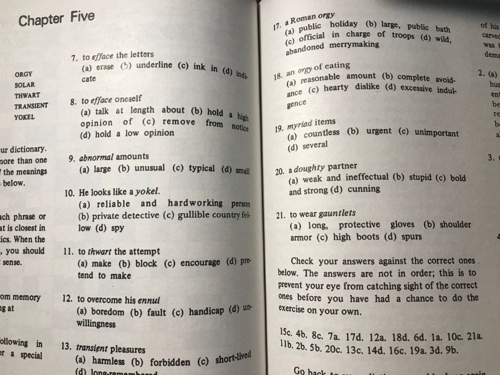 Note that the words “yokel,” “ennui,” “transient,” and “orgy” appear in the same lesson and how quaint yokel’s definition comes off: a “gullible country fellow” and how orgy’s definition – “wild, abandoned merrymaking” – sidesteps its sexual content altogether. I learned early in my career that having students write sentences using unfamiliar words was a waste of time, for the same reason I discouraged them from consulting thesauruses: they more often than not misuse the word because they don’t know its connotations. (Here’s a great example of thesaurus misuse from an earlier post).