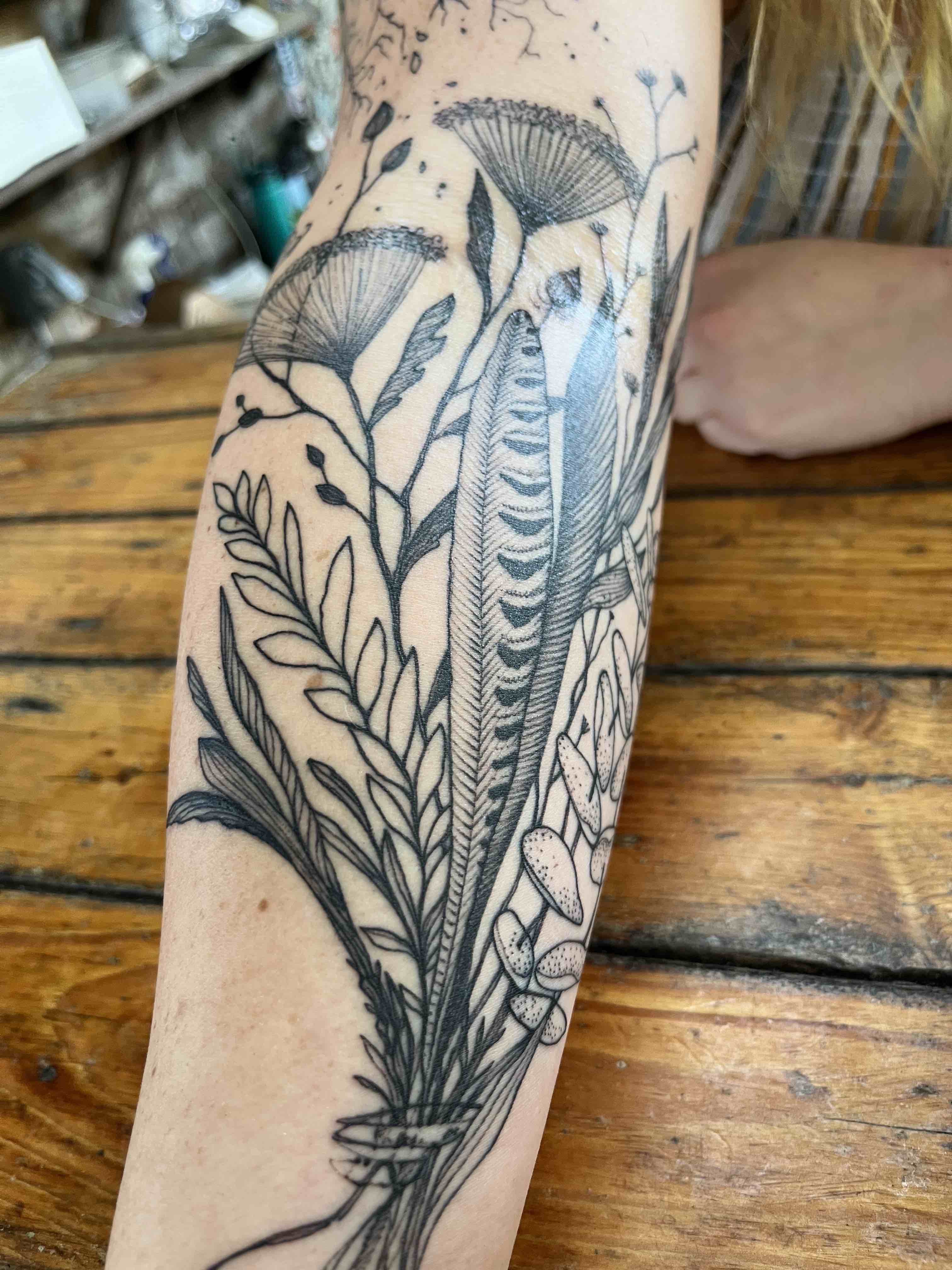 On the corner of the bar sat Jenny, a former colleague. Her husband Allan had just purchased a Harley, so they were in the best of moods. My pal Greg was a-foot, and bartender Katie had just gotten a new tattoo (pictured below). I checked my phone. Clemson, who had been ahead at the Drop-In were two touchdowns down (PRAISE HIS NAME!). Wait, what was this? My missing credit card hiding beneath another! (PRAISE HIS NAME!)