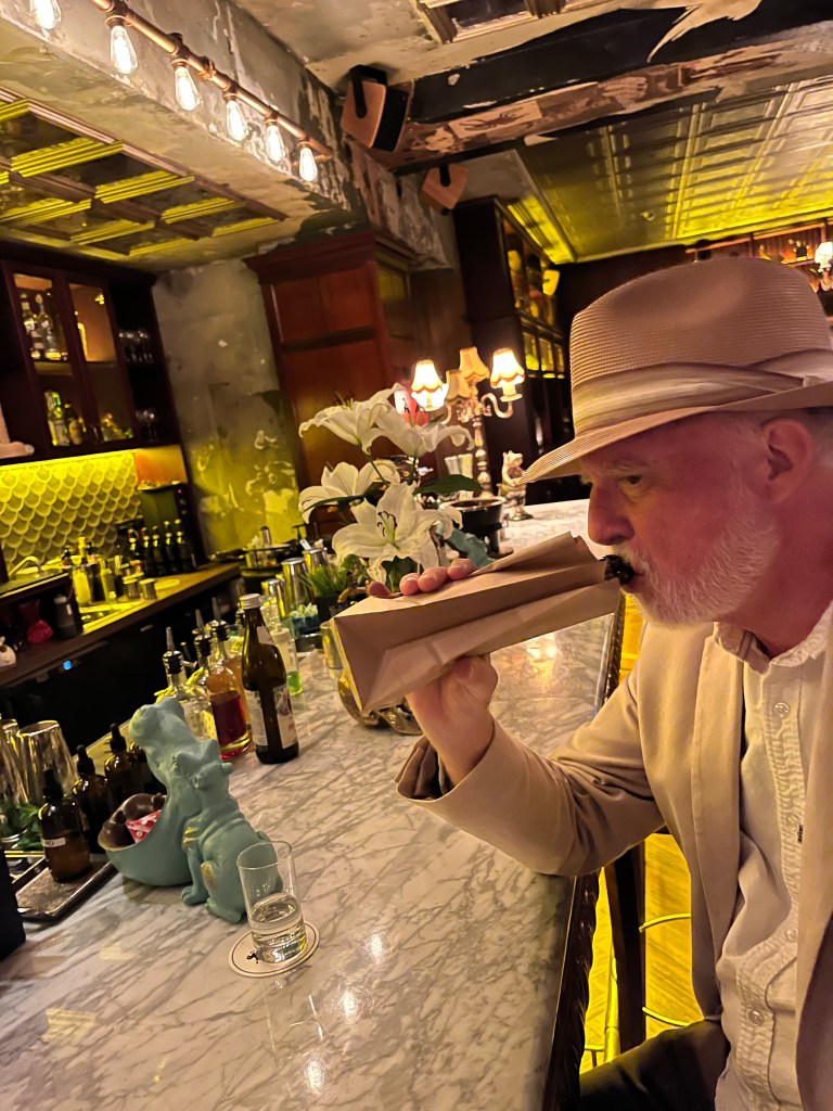 Bellboy pretends to be a speakeasy. There are no signs anywhere, not one outdoors announcing its existence, nor are the doors to the toilet marked. Caroline and I sat at the bar watching mixologists put on quite a show, pouring liquids from container to container, creating rope-like streams, shaking concoctions in ice filled metal containers like Cuban percussionists. Waiters took your orders, slipping up behind you, and rarely did you encounter the same one consecutively. Anyway, when my beer arrived, it was sheathed in a brown paper bag. Ragtime jazz pulsated from the speakers. Otherwise, the crowd looked like your run-of-the-mill German Büroarbeiters.[1] No one sported chaps with the butt-baring cuttouts or conical bras fashioned from poptoptabs.