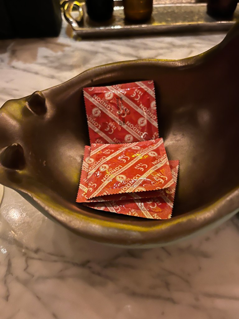 One nice touch, I thought, were bowls shaped like hippopotami bearing condoms positioned every few feet on the bar. We noticed a bartender placing a condom in one ridiculously elaborate drink he was constructing. I asked, “Did you just put a condom in that drink?” and he answered, “of course,” as if I were some kind of rube, so for the rest of the night, whenever I engaged the staff in conversation, I laid my Dr. John rap on them, letting them know the oysters were “mos scocious,” and the beer “desitively bonnaroo.”