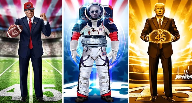 I mean, you’re talking Caligula-grade delusions of grandeur.[1] Check some of these out, a svelte yet swole Trump glistening godlike in poorly photoshopped incarnations from images illegally lifted from the internet.