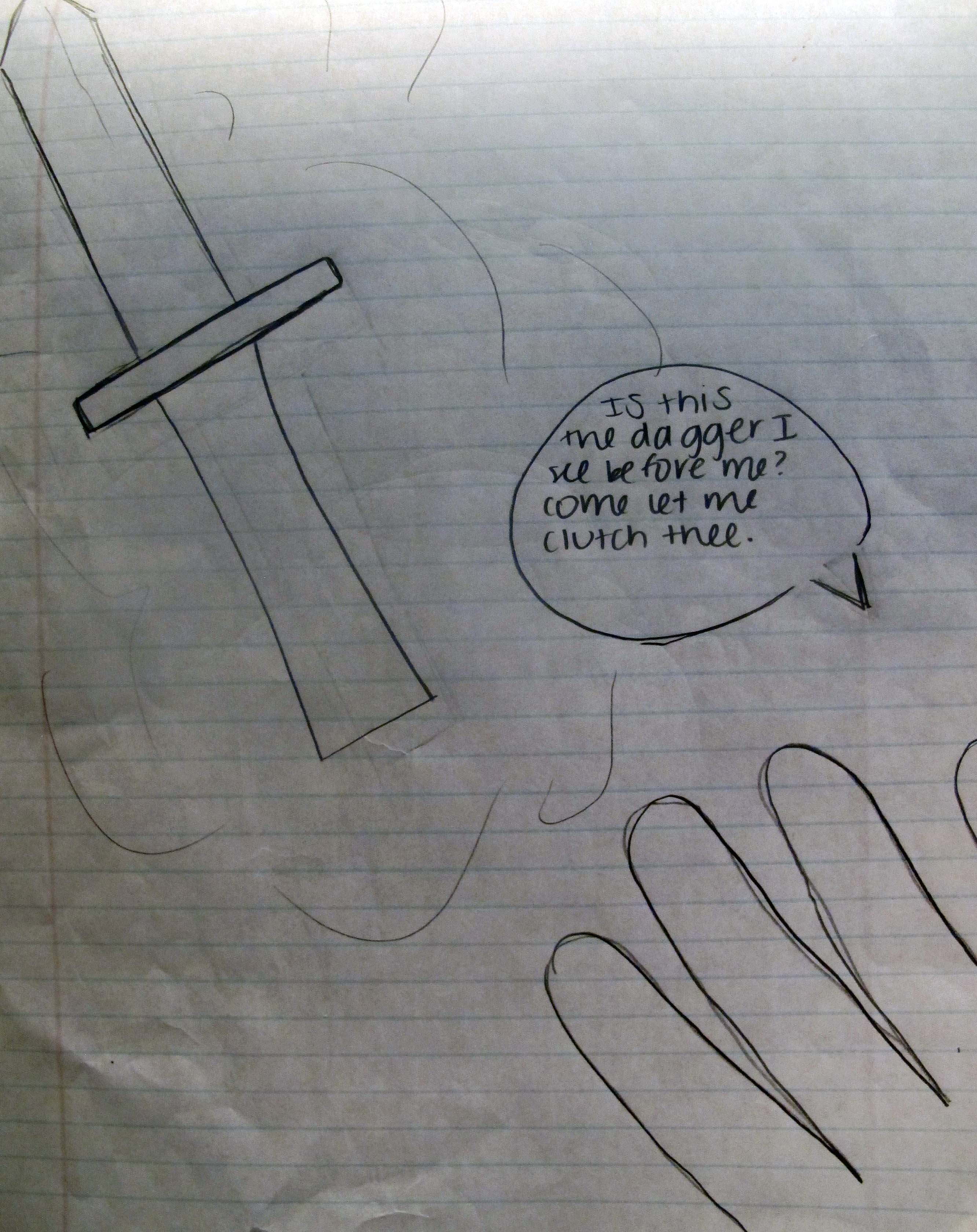 I break the students into groups of three and have them “story board” the “Is this a dagger I see” speech. I encourage them to visualize the scene and then to create 15 to 20 panels depicting how they would choreograph the action providing quotes on the panel. Then we reconvene as a class, and the students present their visions. Here are a view examples from this year.